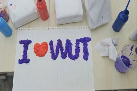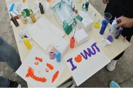 随着作品陆续完成,现场铺展开十余幅主题鲜明的纸浆画:“我爱WUT”的紫色字样旁缀着红心,笑脸图案里藏着“延安精神”的文字注解,还有同学将“党史时间轴”融入画框边缘,让作品既是手工成果,也是微型党史展板。活动尾声,参与者们手持作品合影。