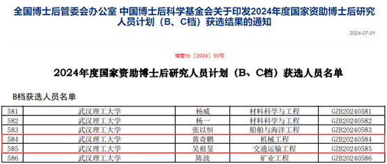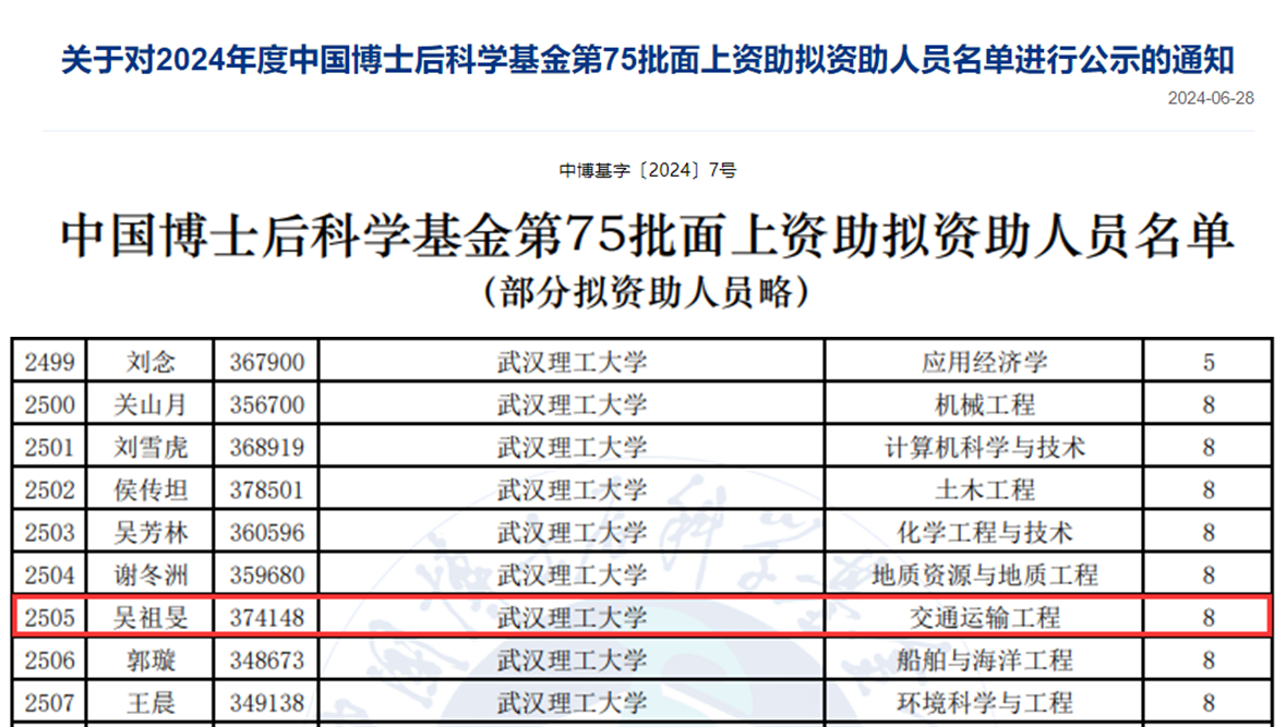据悉,本年度获批中国博士后科学基金第75批面上资助的交通运输工程学科博士后共31人,获批国家资助博士后研究人员计划B档的交通运输工程学科博士后共5人。