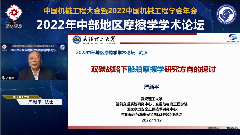 中国工程院院士、成人动作片 严新平教授作了题为“双碳战略下船舶摩擦学研究方向的探讨”的大会特邀报告。