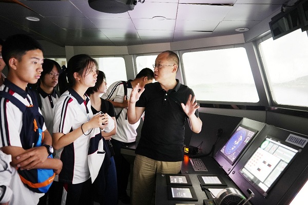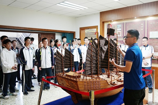 在航海博物馆,科普志愿者为师生们介绍了郑和宝船、郑成功战船、大翼、蓬莱古战船、五牙舰等一艘艘我国古代船舶模型,以及近代各个时期船舶模型及船载航电设备,让同学们对中国古代造船及航海技术的演变过程有了更深的认识。