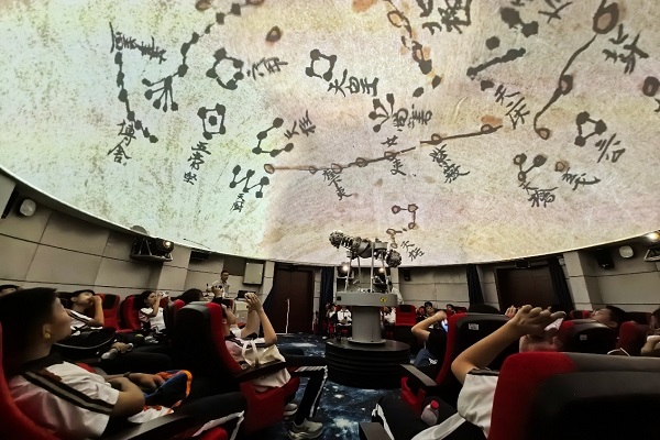 在航海数字天象馆,翁建军老师为师生们介绍了航海导航技术的发展。他悉心讲解天文航海中常用到的星座和天文导航原理,演示了六分仪的使用方法。学生们仰望模拟的浩瀚宇宙,直观地学习了星座知识和天文现象。