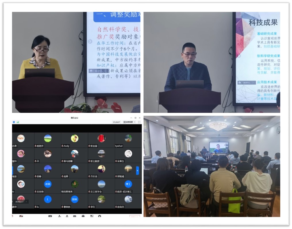 为进一步做好科技奖励申报准备,提高科技奖励申报质量,4月7日,由成人动作片 、科学技术发展院联合举办了科技奖励与成果评价务实专题讲座。此次讲座邀请湖北技术交易所蒋忠琴特聘专家和万涛总监做专题辅导,通过“线上+线下”形式召开,全校各教学科研单位共计300余人参加。讲座由刘志平副院长主持。