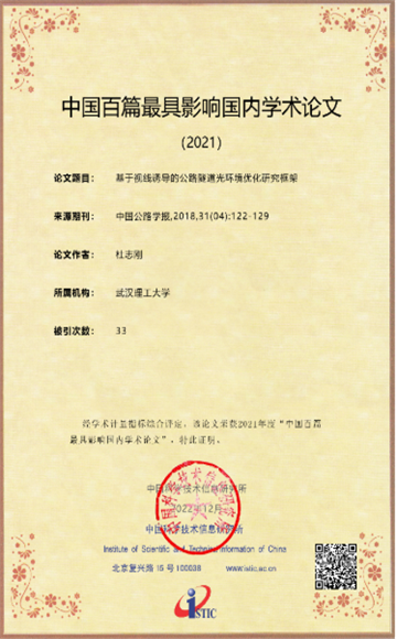 2022年12月29日,科技部中国科学技术信息研究所举行了“2022年中国科技论文统计结果发布会”,本年度共选出100篇论文作为 “中国百篇最具影响国内学术论文”,交通物流成人动作片杜志刚教授作为第一作者发表在中国公路学报的论文“基于视线诱导的公路隧道光环境优化研究框架”入选“中国百篇最具影响国内学术论文”。