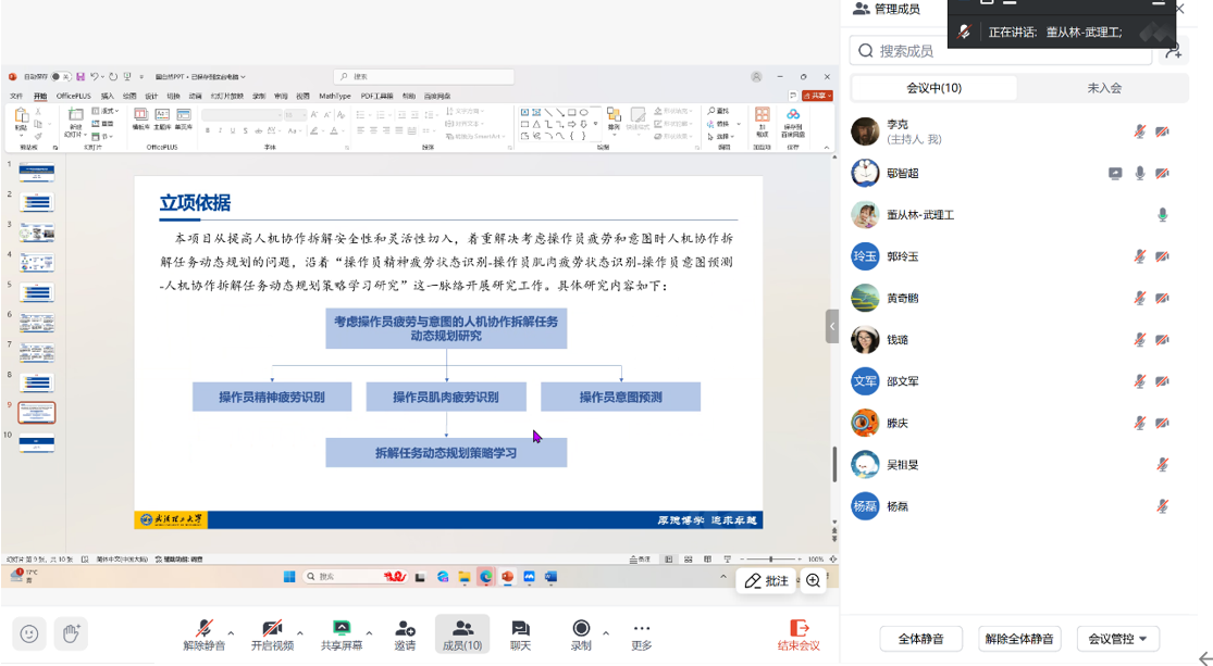 讨论会上,周勇、吴祖旻、黄奇鹏、郭玲玉、滕庆、李克等6位申报教师分别就选题“考虑操作员疲劳与意图的人机协作拆解任务动态规划研究”“响应性仿生水润滑轴承复合材料的设计及摩擦学性能研究”、“跨润滑状态仿生自适应表面构筑及油-固协同润滑机理研究”、“铁基非晶合金的非均匀梯度纳米晶化及其磁学性能研究”、“粘结剂喷射3D打印不可焊镍基高温合金致密化机理与组织性能调控”和“面向精密机械的宽温域油基超滑研究”介绍了申报书的撰写情况。