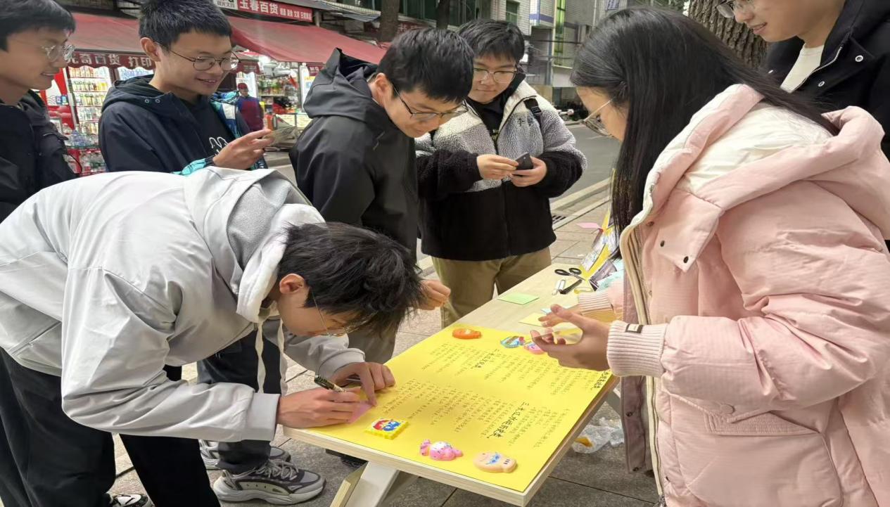 现场氛围热烈:有同学俯身桌前认真写下“保护长江,从点滴做起”的承诺,有过往师生手持定制纪念品驻足聆听讲解,团支部成员则积极为参与者介绍长江水运的历史文化价值及其生态保护意义。活动持续一个下午,“青春护江墙”已贴满暖黄与粉色的便笺,字里行间承载着青年一代对母亲河的深情关切。