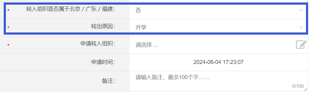 2.“转入组织是否属于北京/广东/附件”选择“否”