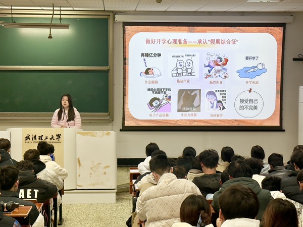 在“收心归位”部分,涂梦老师聚焦“假期综合征”,强调通过调整生物钟、梳理学业任务等方式主动从“观众模式”切换到“车手模式”。她还以“没有规矩,不成赛道”为喻,重申校纪校规与班级公约的重要性,提醒同学们在大学成长路上,遵守“赛道规则”。