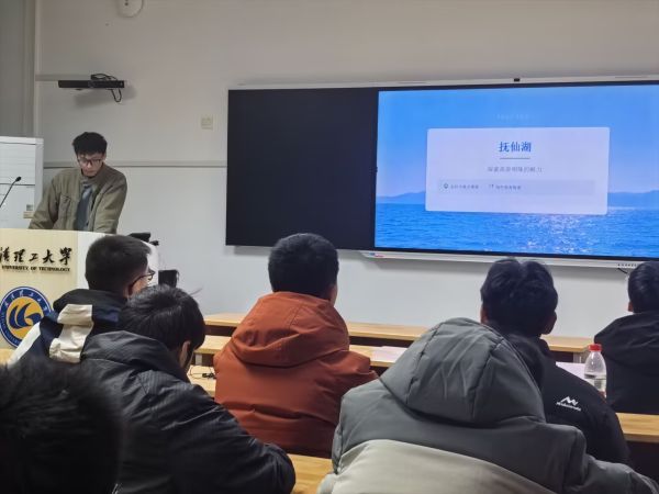 首先分享的是范云龙同学,他向大家讲述了自己的云南之行。他分享了自己在抚仙湖的所见所感,呼吁同学们今后旅游可以避开热门拥挤景点,多去发现这类小众又美丽的地方,感受自然本真的魅力。