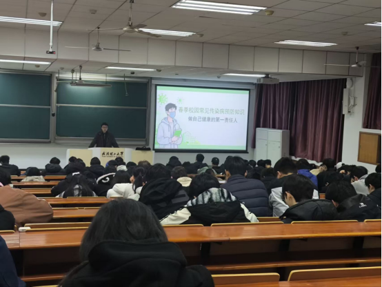 首先从春季气温变化频繁、人体免疫力易出现波动等多方面,深入分析了春季成为传染病高发期的原因,引导同学们树立 “做自己健康的第一责任人” 的核心意识,从思想上重视自身健康防护工作。紧接着,针对校园内春季高发的流感、肺结核、水痘、诺如病毒感染等常见传染病,辅导员逐一细致讲解了各类传染病的传播特点、典型临床症状及科学防控要点。此外,辅导员还细化解读了校园健康防护 “五要” 准则,从勤洗手、常通风、科学戴口罩、规律作息加强锻炼、身体不适及时就医这五个方面,为同学们明确了日常健康防护的具体要求,反复强调预防传染病的关键在于从细节入手,做到 “管好手和口”,切实筑牢个人健康防线。