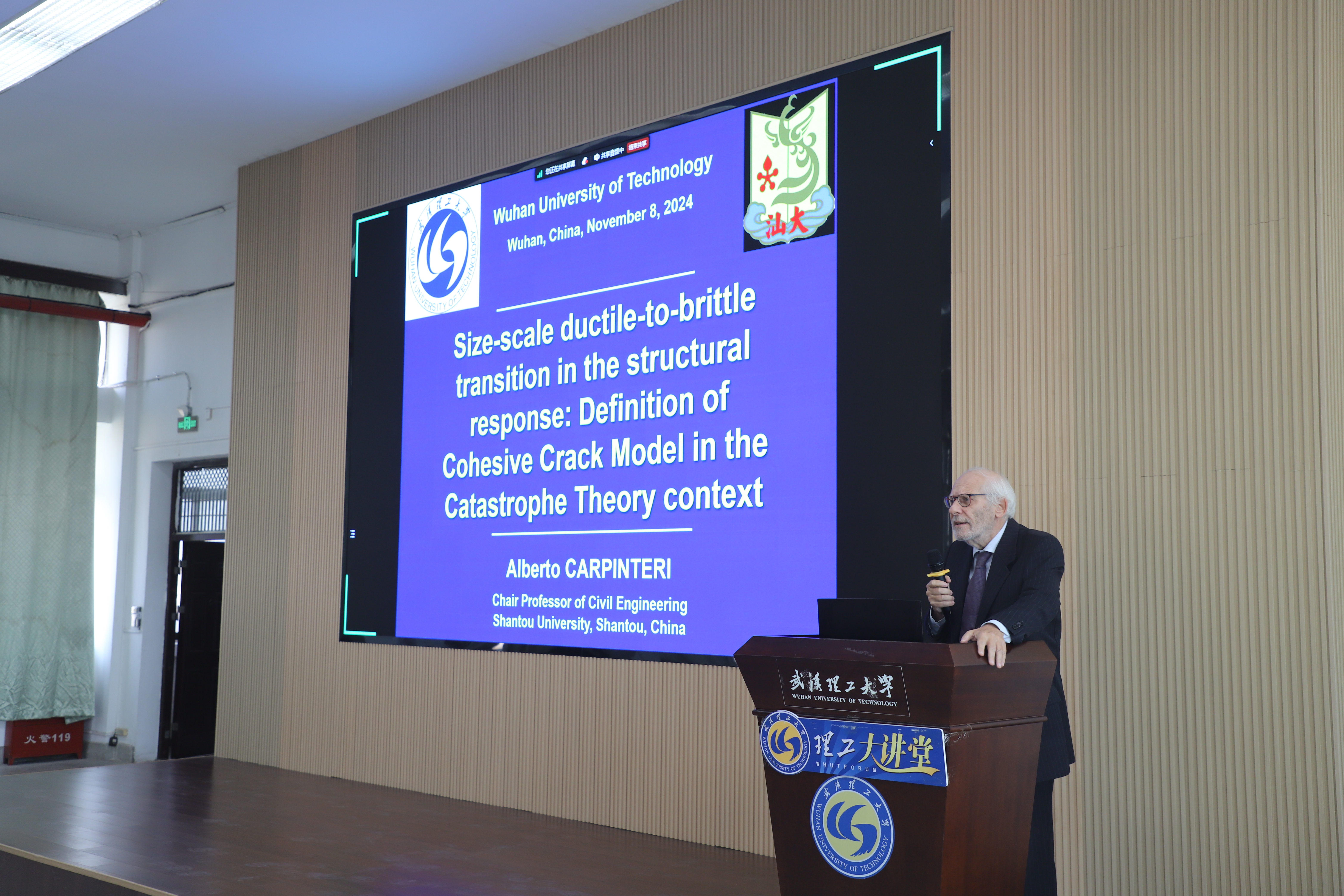 Alberto Carpinteri教授报告题目为《结构响应中韧性到脆性转变的尺寸效应:内聚裂缝模型在突变理论背景下的应用》,详细分析了结构响应中的尺寸效应,特别是从韧性到脆性的转变,并通过内聚裂缝模型在突变理论背景下的应用,阐释了这一转变对材料科学和工程实践的重要意义。他的演讲不仅展示了尺寸变化如何影响材料行为,还讨论了能量释放、损伤局部化以及脆性数在结构稳定性中的关键作用,为理解和预测材料在不同应用场景下的性能提供了理论基础。