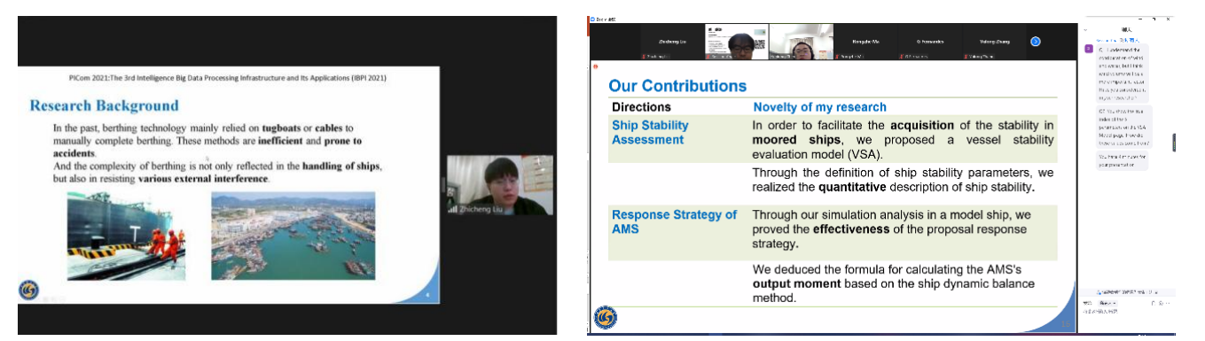2021年10月28日,成人动作片 IROS实验室的两名硕士研究生刘志诚、陈昀龙参加了国际学术交流会议:PICom 2021(The 3rd Intelligence Big Data Processing Infrastructure and Its Applications (IBPI 2021) ),并分别就自动靠泊和自动系泊方向的创新研究做了学术汇报。