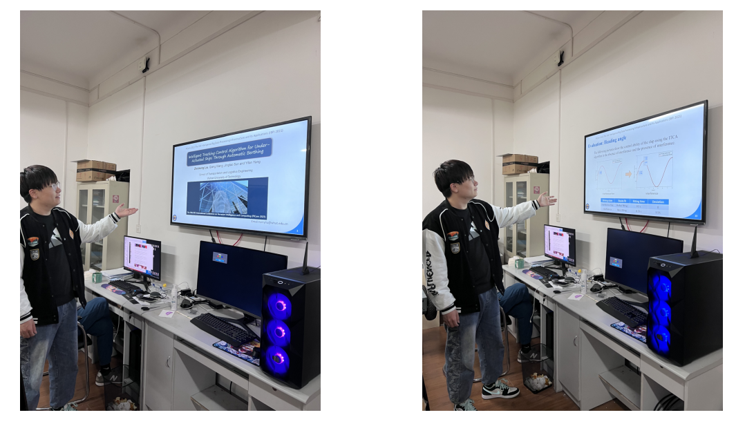 2020级机械工程专业硕士生刘志诚汇报的题目是《Intelligent Tracking Control Algorithm for Under-Actuated Ships Through Automatic Berthing》。刘志诚聚焦当前“互联网+”和大数据形势下的智慧港口建设问题中的船舶控制领域,分析了现阶段在当前船舶靠泊控制的发展过程中,传统的管控方式已不能满足当前的发展需要,基于此,提出了一种船舶自动靠泊控制算法ITCA,用于抑制靠泊时受到的风浪影响。从长远角度来看,此项目可以降低港口的人工成本,并且还可以更多的应用于船舶的智能航行领域。