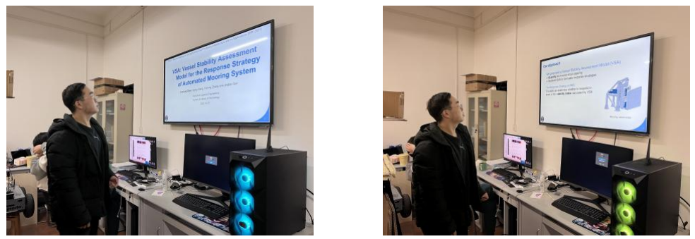 2020级机械工程专业硕士生陈昀龙汇报的题目《VSA: Vessel Stability Assessment Model for the Response Strategy of Automated Mooring System》。陈昀龙聚焦于智慧港口建设问题中的自动系泊控制领域,分析了现阶段在当前船舶系泊控制的发展过程中,随着智慧港口建设的加速,以及全球贸易的昌盛,港口的吞吐量日益上升,为了提高港口的作业效率,传统缆绳系泊方式已经愈发不能满足港口的发展需求。接着介绍了新型系泊自动系泊系统,该自动系泊系统采用系泊机器人进行工作,能够有效地系紧船舶,但还无法主动响应帮助船舶获得更好的稳定系泊状态。基于此,提出了一种适用于系泊船舶的稳性评估模型,以及基于船舶稳性的自动系泊系统响应策略,用于对船舶稳性定量分析以及使得自动系泊系统能够主动响应帮助船舶获得更好的船舶稳性从而具有更好的抵抗来自风浪流的作用的能力。