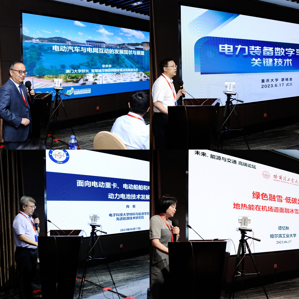 “未来·能源与交通”高端论坛上半场由河海大学鞠平教授主持,澳门大学宋永华教授、重庆大学廖瑞金教授、电子科技大学向勇教授、哈尔滨工业大学谭忆秋教授分别作题为《电动汽车与电网互动的发展现状与展望》《电力装备数字孪生关键技术》《面向电动重卡、电动船舶和电动航空的动力电池技术发展》《地热能在机场道面融冰雪技术中的应用》的学术报告。论坛下半场由同济大学方守恩教授主持,长安大学沙爱民教授作了题为《高速公路自洽能源系统发展模式与展望》、大连海事大学弓永军教授作了题为《智能船舶研发与海事人才培养模式创新》、中南大学高广军教授作了题为《列车防积雪结冰研究》的学术报告。7位专家聚焦能源与交通领域前沿科技,作了精彩的学术分享和交流。